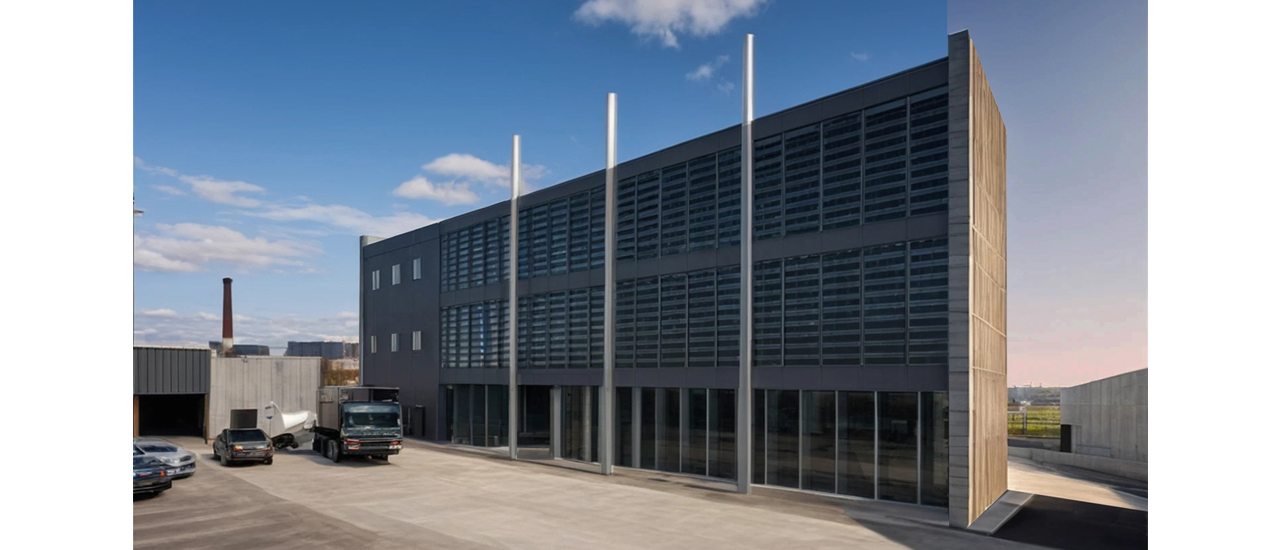 La demolizione di una linea di capannoni fatiscenti porta alla realizzazione di un moderno edificio di uffici a struttura in c.a. faccia a vista e acciaio.